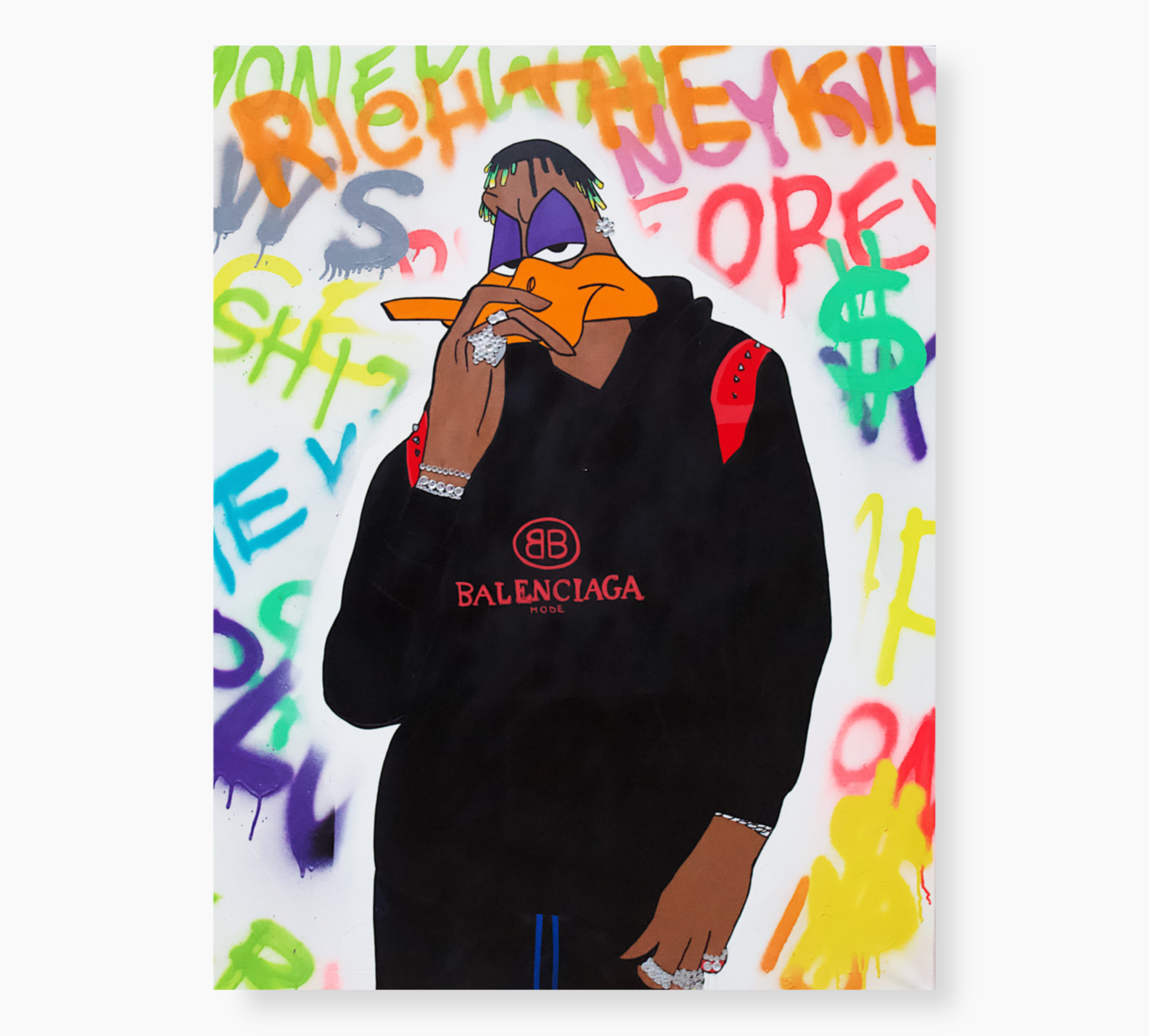 100 x 120 cm | 39.4 x 47.2 inchesDaffy Duck stands proudly after finishing his latest graffiti creation