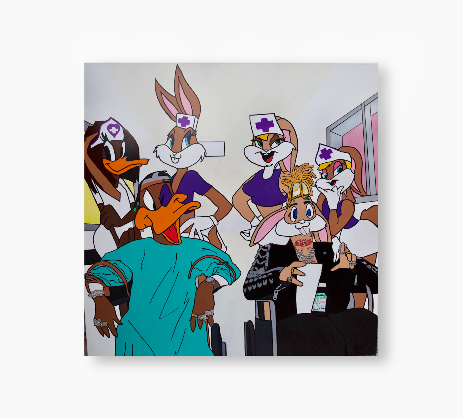 Daffy Duck and Bugs Bunny enjoy luxury hospital life, draped in designer fits and iced-out jewelry. Surrounded by stylish nurses, this playful artwork fuses cartoon mischief with hip hop culture and pop art flair, turning recovery into a lavish party.