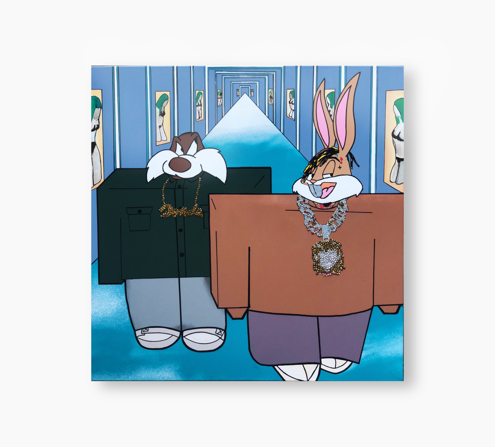 Bugs Bunny and Yosemite Sam channel the iconic I Love It music video by Lil Pump and Kanye West, rocking oversized boxy outfits and iced-out chains as they strut confidently through a surreal, museum-like hallway.