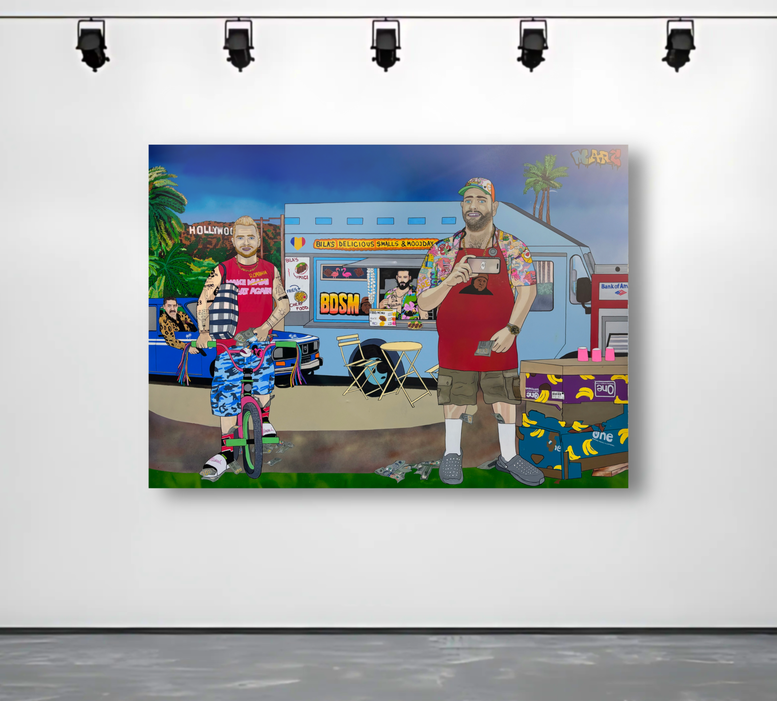 A custom-made painting featuring the main characters from the hit movie Miami Bici 2, now taking over Los Angeles in true Romanian style. Surrounded by palm trees, luxury, and Hollywood energy, the crew enjoys a carefree and hilarious time, blending their unmistakable humor with the glam of LA.