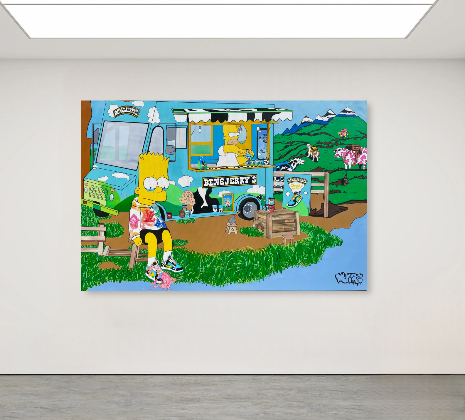 Bart has just spilled his ice cream all over his brand new Ben & Jerry’s Nikes, capturing a moment of frustration. Meanwhile, his father, Homer, proudly stands as Employee of the Year — not at work, but in his true calling: eating ice cream.