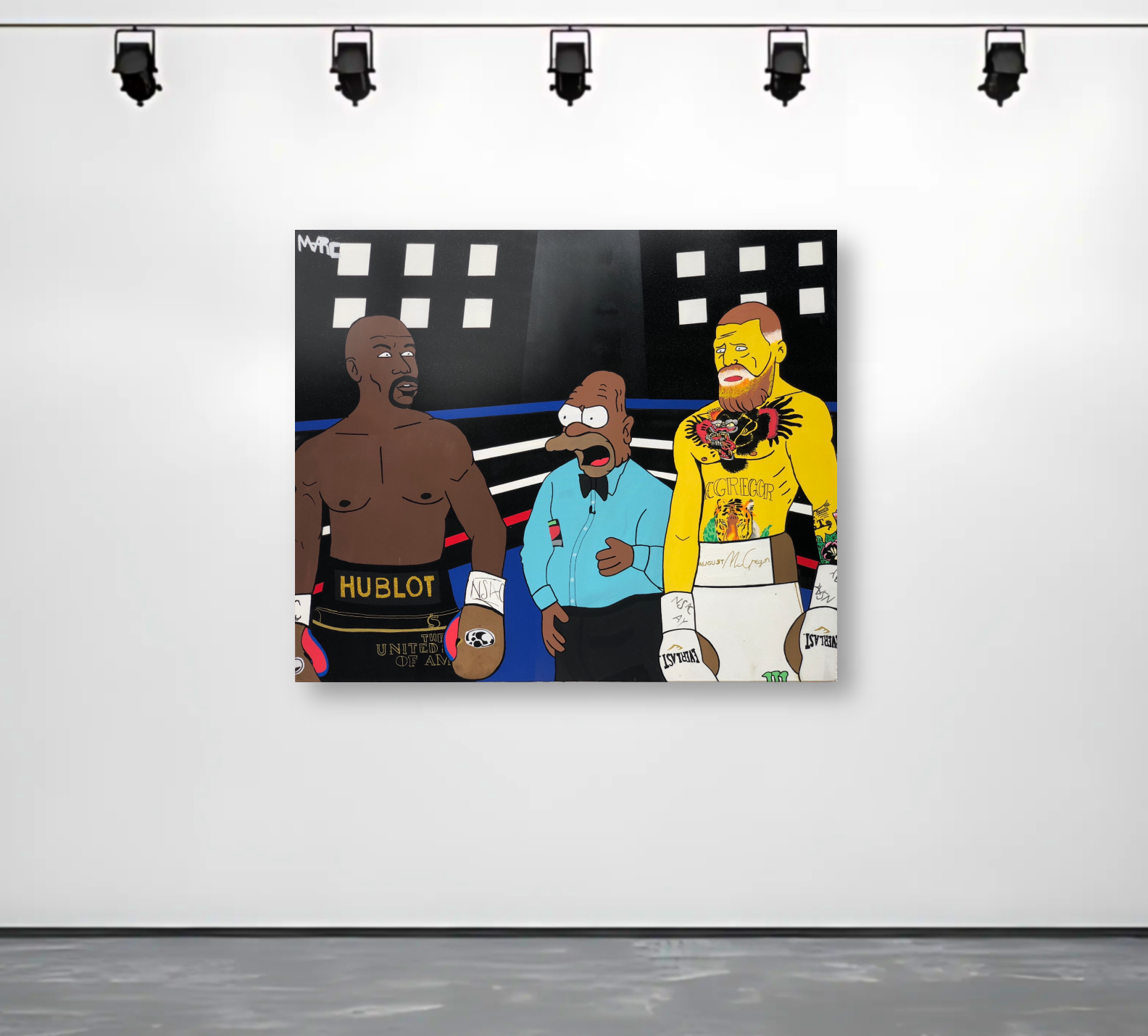 The iconic showdown between Floyd Mayweather and Conor McGregor reimagined through the lens of The Simpsons. In this playful and bold artwork, both fighters face off in true cartoon fashion — gloves up, intense stares, and surrounded by the electric atmosphere of fight night.